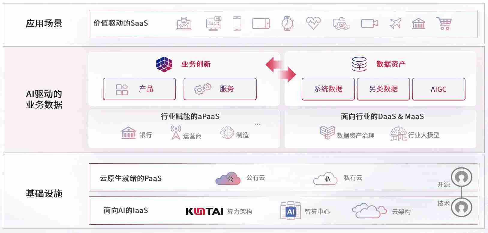 数字时代,,,围绕企业数字化转型的关键要素,,南宫28wd数码开创性的提出数云融合战略和技术体系框架,,着力在云原生、、数字原生、、、、AI原生和信创产业上架构产品和服务能力,,,,为处在不同数字化转型阶段的快消零售、、汽车、、金融、、、医疗、、、政企、、、教育、、、运营商等行业客户提供泛在的敏捷IT能力和融合的数据驱动能力,,,,构建跨界融合创新的数字业务场景和新业务模式,,,助力企业级客户建立面向未来的核心能力和竞争优势,,,全面推动社会的数字化、、智能化转型升级。。。